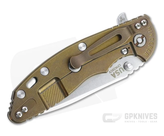 Handle: Titanium frame and liner come in a matching stonewashed bronze anodized finish that hides wear with style while the textured G10 scale and jimping provide a secure grip. Equipped with a steel lock face insert, the integral frame lock has solid lockup and smooth operation for safe use. The Hinderer LockBar Stabilizer, titanium clip insert and hardware make this a fully customizable modular design.