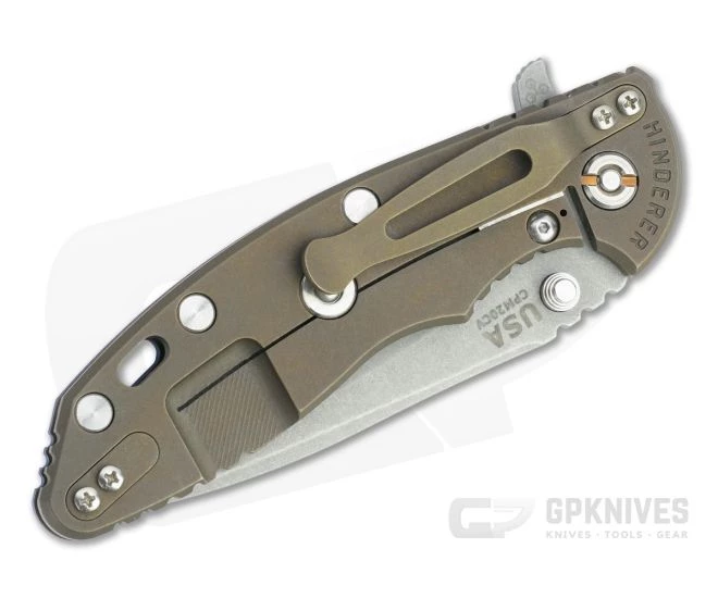 Handle: Titanium frame and liner come in a matching Battle Bronze, anodized Working Finish, that hides wear with style while the textured G10 scale and jimping provide a secure grip. Equipped with a steel lock face insert, the integral frame lock has solid lockup and smooth operation for safe use. The Hinderer LockBar Stabilizer, titanium clip insert and hardware make this a fully customizable modular design.