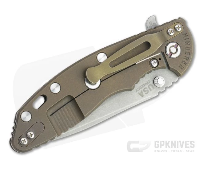 Handle: Titanium frame and liner come in a matching Battle Bronze, anodized Working Finish, that hides wear with style while the textured G10 scale and jimping provide a secure grip. Equipped with a steel lock face insert, the integral frame lock has solid lockup and smooth operation for safe use. The Hinderer LockBar Stabilizer, titanium clip insert and hardware make this a fully customizable modular design.