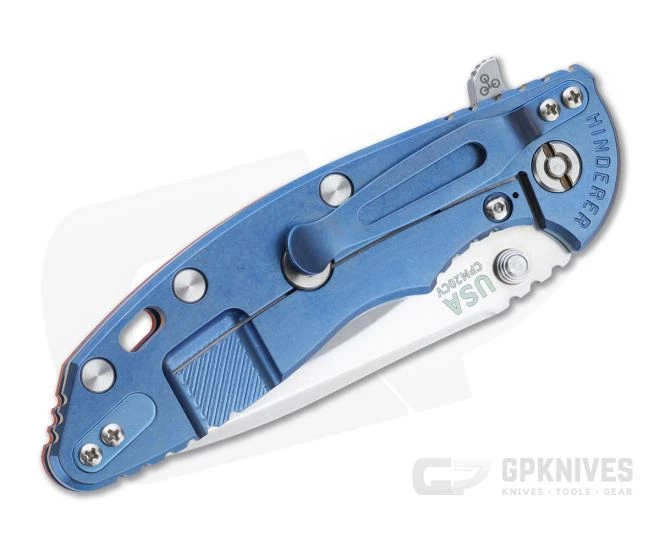 The Hinderer Knives XM-18 3.5” is a precision-crafted hard-use tactical folder you can carry every day. It features an integral flipper tab and dual thumb studs for fast, easy operation in a mid-sized platform designed to fit most hands comfortably while handling nearly any task. Easy, one-hand operation and a reliable lock system are the foundation of the XM series. This recurve variant comes with a stonewashed 20CV blade, blue anodized frame and orange G10 scale.