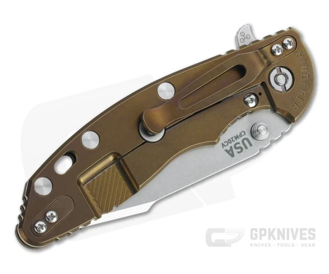 Handle:Â Full titanium frame lock and liner have a matching stonewashed bronze anodized finish that look great while hiding wear from carry. Satin hardware and standoffs create a solid handle while a 3D textured G10 scale coupled with strategically placed jimping delivers traction in hand. Additional features include the Hinderer Lockbar Stabilizer, titanium clip insert and customizable modular design. The Skinny design reduces thickness and weight for a better carry experience.