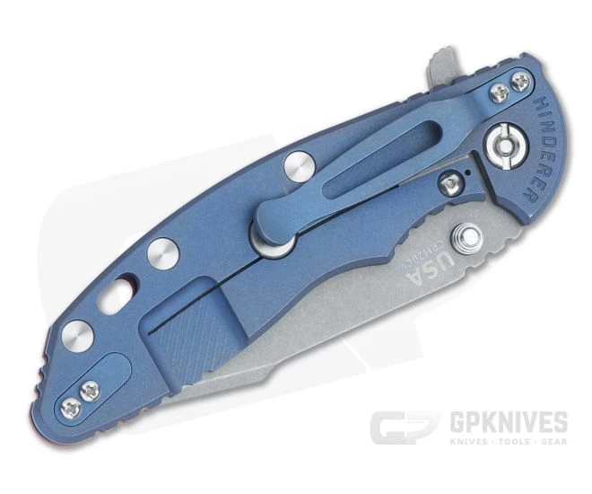 Handle:Â Full titanium frame lock and liner are matching Battle Blue (anodized Working Finish) that looks great while hiding wear from carry. Satin hardware and standoffs create a solid handle while a 3D textured G10 scale coupled with strategically placed jimping delivers traction in hand. Additional features include the Hinderer Lockbar Stabilizer, titanium clip insert and customizable modular design. The Skinny design reduces thickness and weight for a better carry experience.