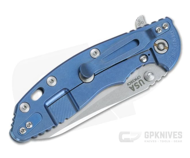 Handle: Â Full titanium frame lock and liner have a matching Stonewash Blue finish that hides wear well while and has a handsome look appropriate to this hard working tool. Satin Hardware and standoffs create one solid package while 3D texturing on the G10 scale coupled with jimping all around create a solid grip. There is also a bit of a choil to choke up on the blade for more detailed cutting tasks as well. Includes the famous Hinderer Lockbar Stabilizer.