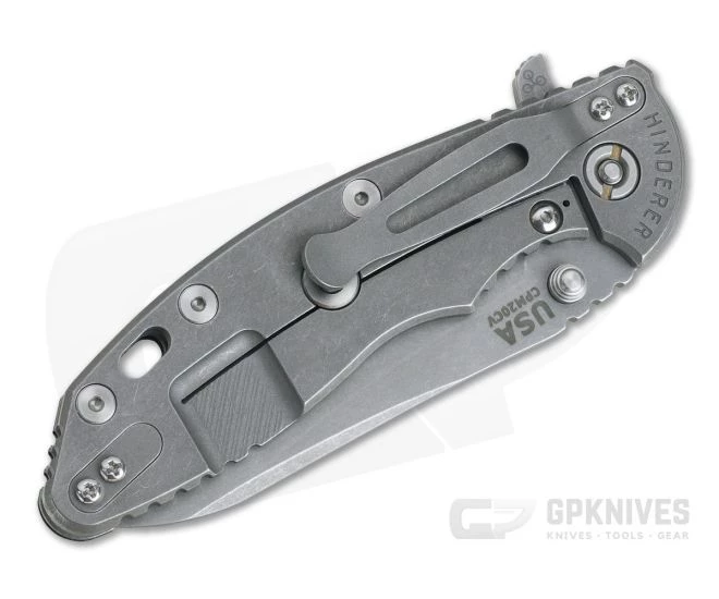 Handle: Full titanium frame lock and liner have a matching Working Finish that hides wear well while and has a handsome look appropriate to this hard working tool. Satin Hardware and standoffs create one solid package while 3D texturing on the G10 scale coupled with jimping all around create a solid grip. There is also a bit of a choil to choke up on the blade for more detailed cutting tasks as well. Includes the famous Hinderer Lockbar Stabilizer.