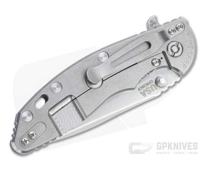 Handle: Titanium frame and liner come in a matching stonewashed finish that hides wear from carry and use while the textured G10 scale and jimping provide a secure grip. Equipped with a steel lock face insert, the integral frame lock has solid lockup and smooth operation for safe use. The Hinderer LockBar Stabilizer, titanium clip insert and hardware make this a fully customizable modular design.
