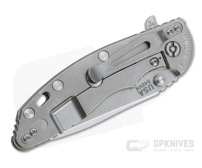 Handle:Â Full titanium frame lock and liner have a stonewashed finish that is rugged and hides wear well while still having a striking visual appeal. Satin Hardware and standoffs create one solid package while a 3D textured G10 scale coupled with strategically placed jimping provides a solid grip. A blade choil allows for a more forward grip for controlled work. Additional features include the Hinderer Lockbar Stabilizer, titanium clip insert and customizable modular design.