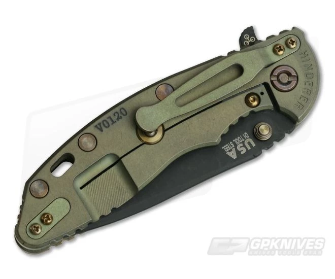 Handle: Â Full titanium frame lock and liner have a matching Battle Green Finish (anodized green Working Finish) that is rugged and hides wear well while having a classic visual appeal when paired with the handsome Smooth Walnut scale. Bronze Hardware and standoffs create one solid, easy to maintain package. A forward choil, strategically placed jimping and an ergonomic handle design delivers security and control in the hand. Includes the Hinderer Lockbar Stabilizer for added performance.