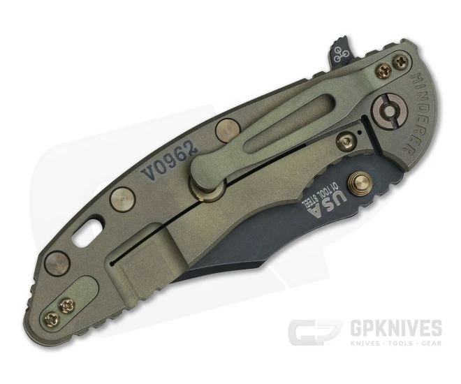 Handle: Â Full titanium frame lock and liner have a matching Battle Green Finish (anodized green Working Finish) that is rugged and hides wear well while having a classic visual appeal when paired with the handsome Smooth Walnut scale. Bronze Hardware and standoffs create one solid, easy to maintain package. A forward choil, strategically placed jimping and an ergonomic handle design delivers security and control in the hand. Includes the Hinderer Lockbar Stabilizer for added performance. S/N V0962.