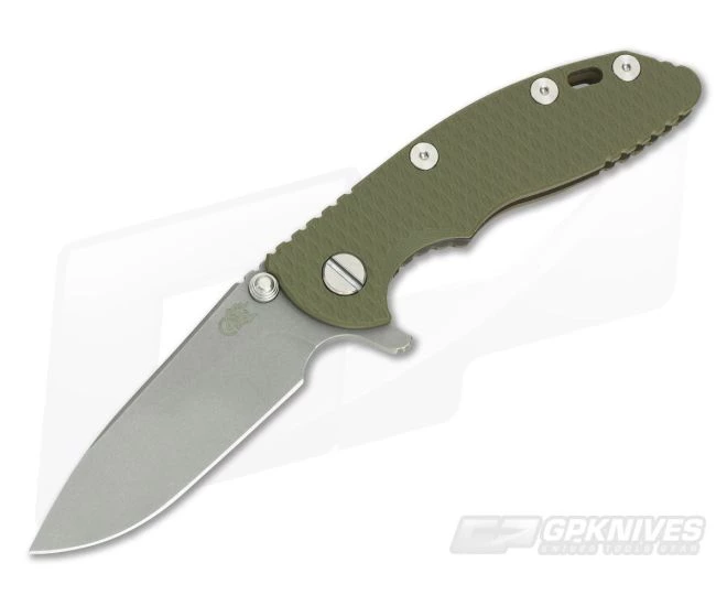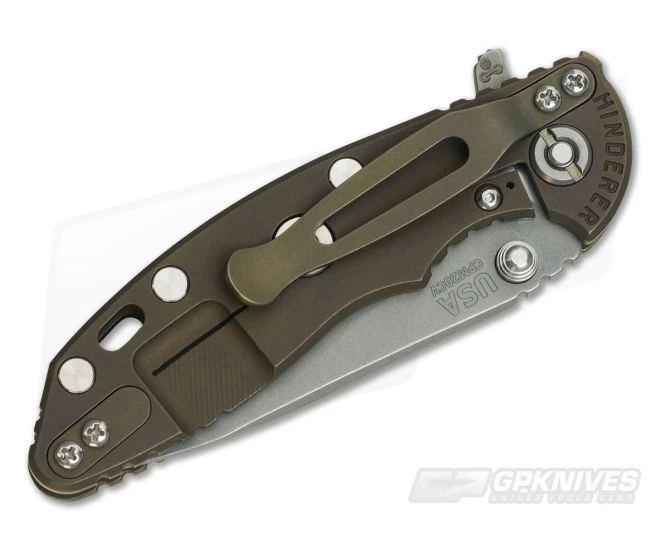 Handle:Â Full titanium frame lock and liner have a matching Battle Bronze finish that is catchy and hides wear over time. A 3D textured olive drab G10 scale coupled with jimping all around creates a secure grip. The XM-18 includes the iconic Hinderer Lockbar Stabilizer and battle bronze two-position titanium clip and insert for tip up or down, right hand carry.
