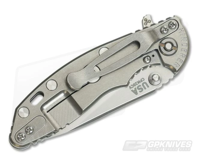 Handle:Â Full titanium frame lock and liner have a matching bright Stonewashed finish that is rugged and hides wear over time. A 3D textured Grey G10 scale coupled with jimping all around creates a secure grip. The XM-18 includes the iconic Hinderer Lockbar Stabilizer and two-position titanium clip and insert for tip up or down, right hand carry.