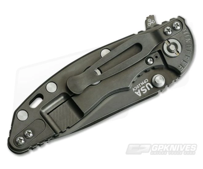 Handle: Full titanium frame lock and liner have a matching Stonewash DLC that is visually appealing and and highly durable. A 3D textured Black G10 scale coupled with jimping all around creates a secure grip. The XM-18 includes the innovative Hinderer Lockbar Stabilizer and Working Finish, two-position titanium clip and insert for tip up or down, right hand carry.