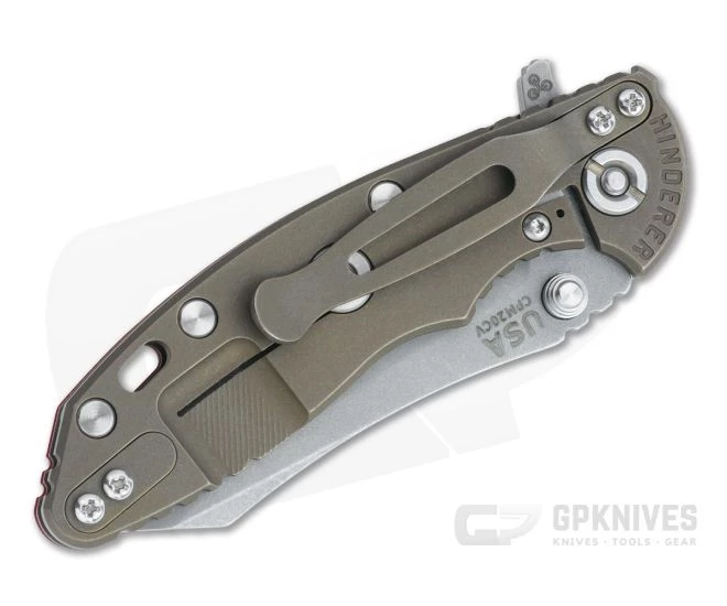 Tri-Way Pivot: The newest innovation from Rick Hinderer, the Tri-Way pivot features milled pockets in the blade and frame allowing for the use of ball bearing pivot washers (installed) or, utilizing steel spacers to fill those pockets, you can use either of the included sets of nylon or bronze washers to customize the action and operation of your knife.