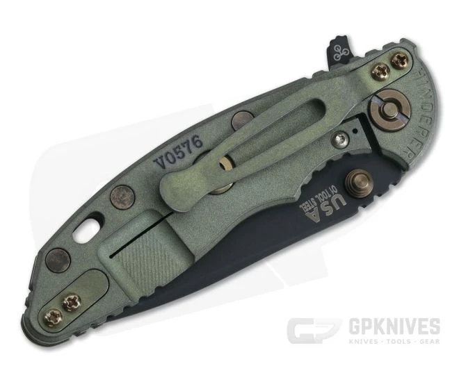 Handle: Â Full titanium frame lock and liner have a matching Battle Green Finish (anodized green Working Finish) that is rugged and hides wear well while having a classic visual appeal when paired with the handsome Textured Walnut scale. Bronze Hardware and standoffs create one solid, easy to maintain package. A forward choil, strategically placed jimping and an ergonomic handle design deliver security and control during use. The Hinderer Lockbar Stabilizer delivers added performance. Serial #V0576.