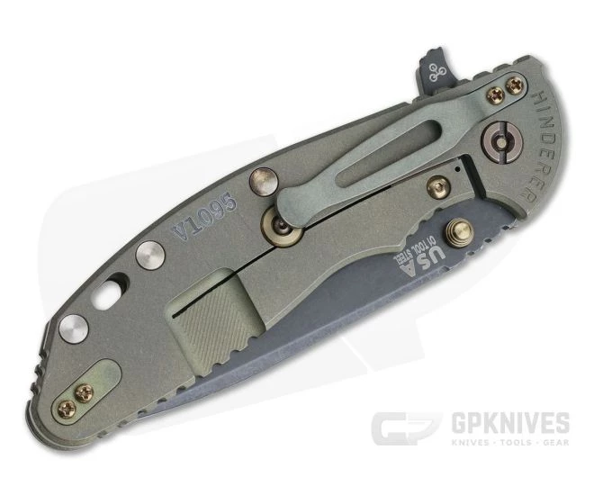 Handle:Â Full titanium frame lock and liner have a matching Battle Green Finish (anodized green Working Finish) that is rugged and hides wear well while having a classic visual appeal when paired with the handsome Smooth Walnut scale. Bronze Hardware and standoffs create one solid, easy to maintain package. A forward choil, strategically placed jimping and an ergonomic handle design deliver security and control during use. The Hinderer Lockbar Stabilizer delivers added performance. Serial #V1095.