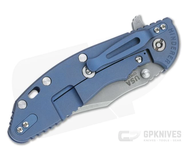 Handle: Titanium frame and liner come in a matching Battle Blue finish, anodized Working Finish, that hides wear with rugged style while the textured G10 scale and jimping provide a secure grip for large hands and gloved users. Equipped with a steel lock face insert, the integral frame lock has solid lockup and smooth operation for safe use. The Hinderer LockBar Stabilizer, titanium clip insert and hardware make this a fully customizable modular design.