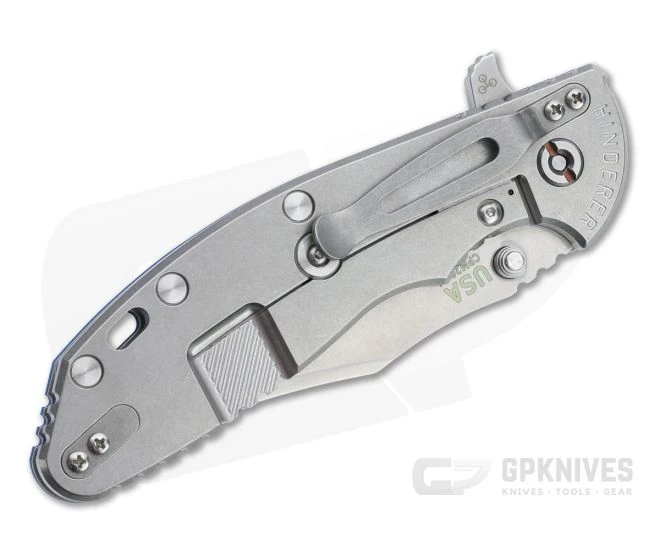 Handle:Â Titanium frame and liner come in a matching stonewashed finish that hides wear with style while the textured G10 scale and jimping provide a secure grip for large hands and gloved users. Equipped with a steel lock face insert, the integral frame lock has solid lockup and smooth operation for safe use. The Hinderer LockBar Stabilizer, titanium clip insert and hardware make this a fully customizable modular design.