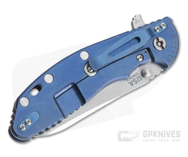 Handle: Â Full titanium frame lock and liner have a matching blue anodized stonewashed finish that hides wear while looking great. Satin Hardware and standoffs create one solid package while 3D texturing on the G10 scale coupled with jimping all around create a solid grip. A hardened steel lock face insert doubles as an over travel stop and pairs with the Hinderer Lockbar Stabilizer to deliver a smooth operating, rock solid reliable lock up.