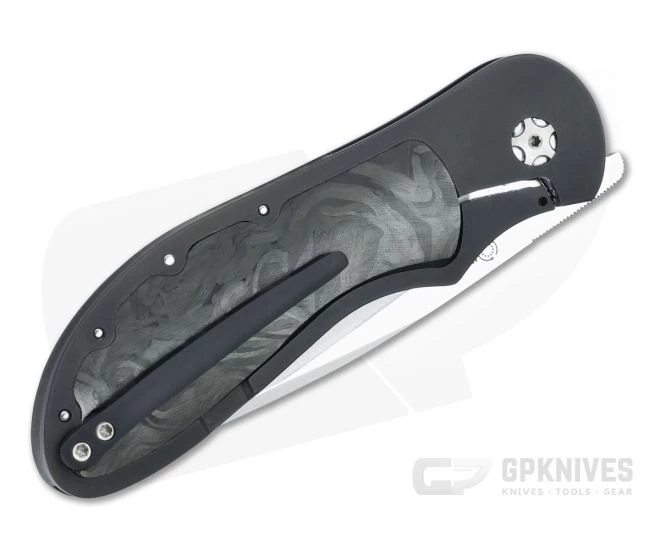 Handle: Made from smooth titanium, the handles are simple, ergonomic and equipped with a dark matte finish. Both front and back sport stunning marbled carbon fiber inlays. The rear frame has been cut to form an integral bolster lock under the inlay for secure operation. Ships in a zippered nylon pouch with Certificate of Authenticity.