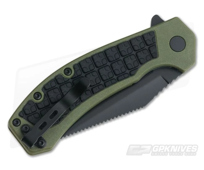 The Handle: Black oxide coated steel liners are inset into OD Green glass filled nylon scales for a lightweight and durable construction. The scales support high traction rubber overmold inserts that provide a secure and comfortable grip. The Faultline’s construction is completed with black hardware, barrel spacers and deep carry pocket clip (right hand, tip-up).