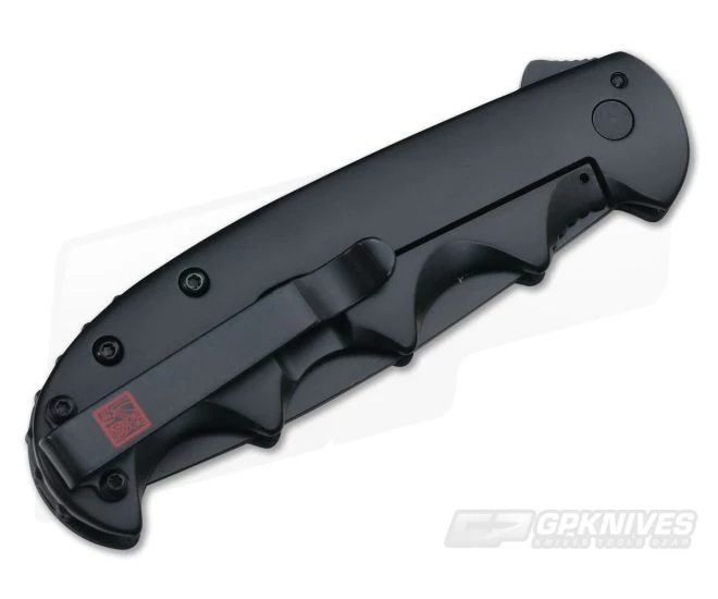 The Handle:Â Two part deep four-finger grooved frame locker handle on the AM-5 that looks sharp and feels great. The front slab is black G-10 that’s been polished, smoothed out and contoured for a comfortable grip. Frame lock side is built from contoured steel that’s been black oxide finished continuing the overall good looks and feel of the Buzzard. They’re brought together by a tread-notched half back spacer. The AM-5 is completed with an attached deep carry pocket clip for tip up right hand users. It is also black oxide finished with Al Mar’s logo. All black Torx hardware construction.