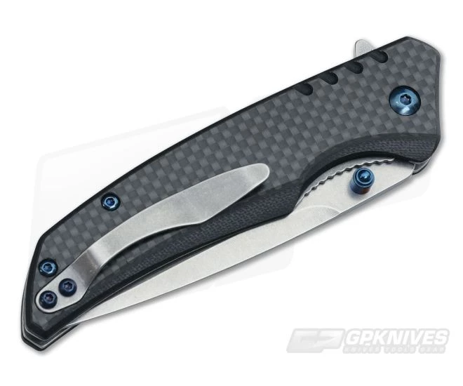 The Handle:Â The scales are black G10 at the base with top layers, or overlays, of carbon fiber for a truly unique look and feel. They are torx (blue) screwed to stainless liners with one forming the solid lockup. It has enough of a cut out and tapered bottom section to cradle right in the palm snuggly. Open standoffs construction and a pocket clip for right hand tip up travel round out the Halogen.