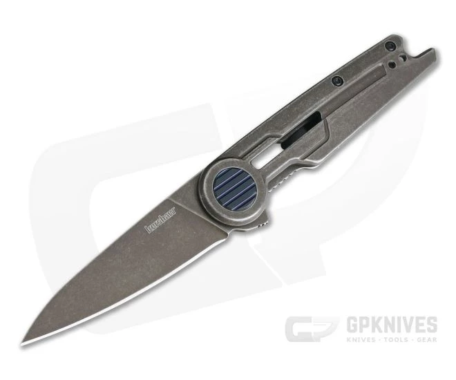 Handle: Constructed of solid stainless steel the handles feature the same tumbled brown PVD coating to match the blade. A large window cutout reduces weight while accenting the modern lines of the design overall. The backside of the handle features a stainless steel frame lock mechanism for sturdy and secure lock-up when you need it most. To complete the look, Kershaw added an oversize blue pivot and matching barrel spacers. The open back construction keeps the weight down while making maintenance a breeze.
