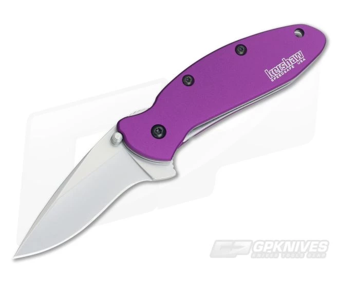 This Kershaw Scallion features a Bead-Blasted 420HC stainless steel blade and deep jewel tone Purple anodized 6061-T6 aluminum handle. Dual thumb studs and flipper for easy opening. SpeedSafe assisted opening with liner lock and safety tip lock. Stainless steel tip-down pocket clip. Brand new direct from Kershaw Knives.