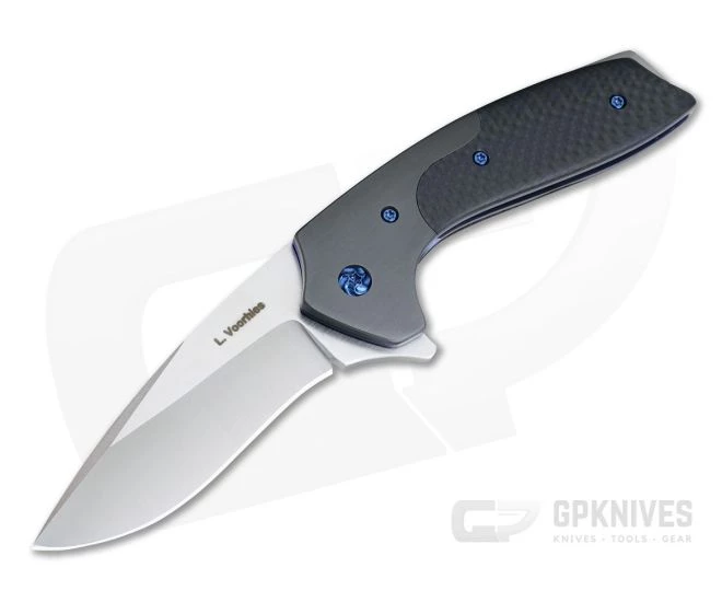 Handle:Â The Claymore starts with 2mm thick titanium liners, one of which forms the rock solid lock. A custom, titanium Torx pivot and screws attach the sweeping Zirconium bolsters and handsome Carbon Fiber scales to the simple, ergonomic handle. Both the titanium liners and hardware, including the clip, have been anodized blue for a pop of color. The flipper tab doubles as an index finger guard and a fin-like stainless steel backspacer protects the blade and has an exposed, striker pommel end. Includes a microfiber baggie and signed/dated card from Mr Les Voorhies.