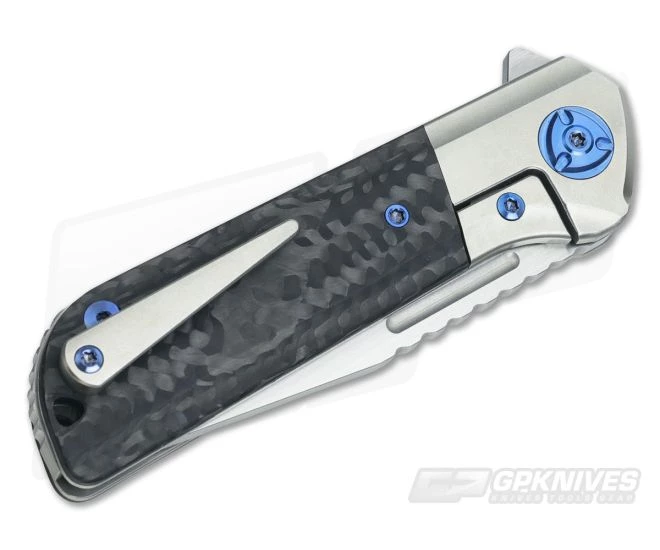 The Handle:Â Titanium bolster lock construction is the foundation of the Lanny. The wire wheel finished bolsters are fitted perfectly with dovetailed Carbon Fiber scales and the whole thing is put together with blue anodized titanium hardware. The Lanny carries via a sleek 3D machined, wire wheel finished titanium pocket clip that can be set up for left or right hand, tip-up carry.