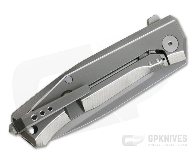 Handle:Â The semi-open back handle construction consists of dual slabs of contoured and textured gray titanium and a matching back spacer. Simple and elegant, the handles offer traction and comfort for secure, extended use. The integral frame lock is reinforced with a hardened steel insert preventing wear from the blade offering smooth operation and secure lockup over the life of the knife. The insert has an extended tab that also prevents lock over travel. A large hole at the pommel end allows for lanyard attachment.