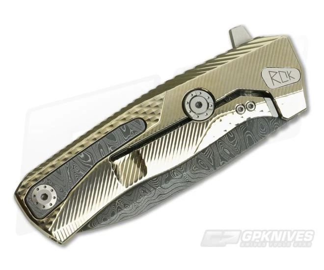 Handle: The integral construction is built from a single piece of billet Gold Anodized Titanium milled using precision 4-axis machining. A combination of grooved and diamond texturing and milled contours delivers an excellent balance of comfort and traction in the hand. The ROK built with a steel insert equipped, integral frame lock mechanism with the added security of the Rotoblock system. The Rotoblock acts as a lock bar stabilizer and when engaged will completely block or lock the lock bar in the engaged position delivering “fixed blade like” reliability. The innovative, spring loaded H.WAYL clip automatically retracts into the handle when not in use for added comfort but is ready for secure carry with a slide of the button.