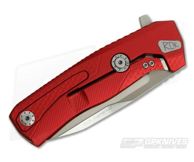 Handle:Â The integral construction is built from a single piece of Red Anodized billet Aluminum milled using precision 4-axis machining. A combination of grooved and diamond texturing and milled contours delivers an excellent balance of comfort and traction in the hand. The ROK built with a steel insert equipped, integral frame lock mechanism with the added security of the Rotoblock system. The Rotoblock acts as a lock bar stabilizer and when engaged will completely block or lock the lock bar in the engaged position delivering “fixed blade like” reliability. The innovative, spring loaded H.WAYL clip automatically retracts into the handle when not in use for added comfort but is ready for secure carry with a slide of the button.