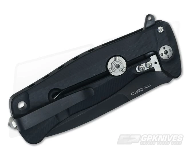The Handle:Â The integral construction is built from a single piece of billet Aluminum milled using precision 4-axis machining. The diamond texturing and milled contours feel fantastic in the hand and provides plenty of traction without feeling aggressive. The Aluminum handle is then finished with a dark Black anodization and is built with an integral frame locking mechanism with the added security of the Rotoblock system. This acts as your your lock bar stabilizer and when engaged will completely block or lock the lock bar in the engaged position. This effectively turns your folder into a fixed blade. Once spun back the other way you are free to release the lock bar. A lanyard hole is built into the handle for personalization.
