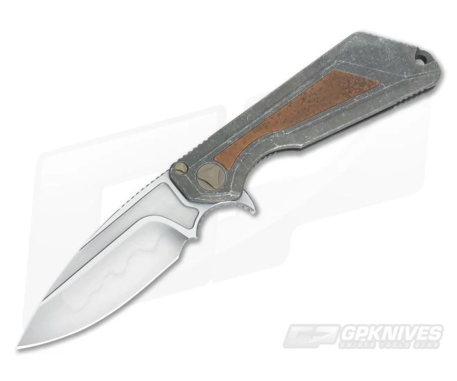 The Handle: Created from a single billet of 6Al4V titanium, this integral handle has an end of days Fallout finish that continues on to the copper inlays. SnG-styled for excellent style and feel in hand with comfy ridges and divots abound. Complete with all bronzed hardware including the solid frame lock’s insert tab. The copper stabilizer ring is a nice touch as well as the inlay in the pocket clip. Killer design between these two where no detail was left behind. Inside the handle you will find the Customs dagger, A. MARFIONE, 06/2017 MSG-3.5, USA and the Serial #023.