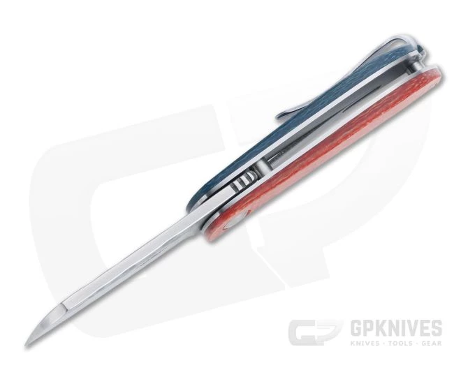 Brimming with their iconic Japanese style, Mcusta delivers a modern front flipper with stylish dress carry appeal in the Petit liner lock. The Tsuchime hammered San Mai Damascus Sheepsfoot pairs with rustic jute Micarta scales in two colors for a striking look, sized perfectly for daily office or dress carry. This version comes with orange and blue Micarta scales.