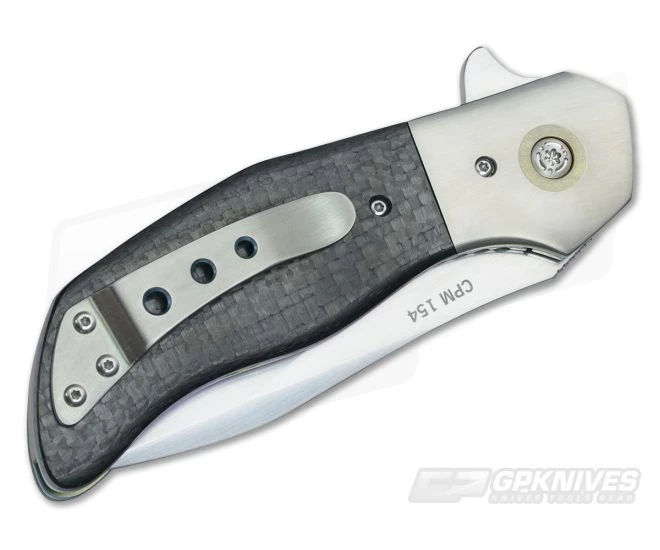 The Blade:Â Big-bellied drop point style with upper swedge grind great for every day utility or in the field. 3.5 inch blade is built from premium CPM-154 steel and given Mike’s famous horizontal hand-rubbed satin finish. There’s small jimping on the thumb rest for precise cutting and an integral flipper tab to deploy the cutting power just as soon as you need it. It rides on a ball bearings pivot for absolutely effortless flipping. Dead-on detent for no wrist-action necessary operation. It locks up solid and disengages easily.