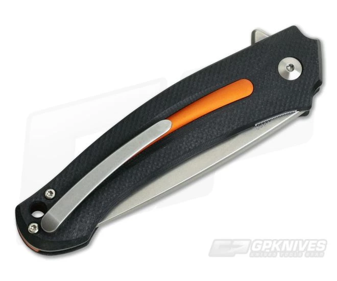 Handle:Â Milled Black G10 scales are executed in a machine micro-textured and contoured design with orange anodized aluminum inlays that complement the G10. The neutral handle design is comfortable in a variety of grips while still being secure thanks to the gentle taper and flared pommel end. An Orange anodized backspacer and stainless steel pocket clip complete this piece.