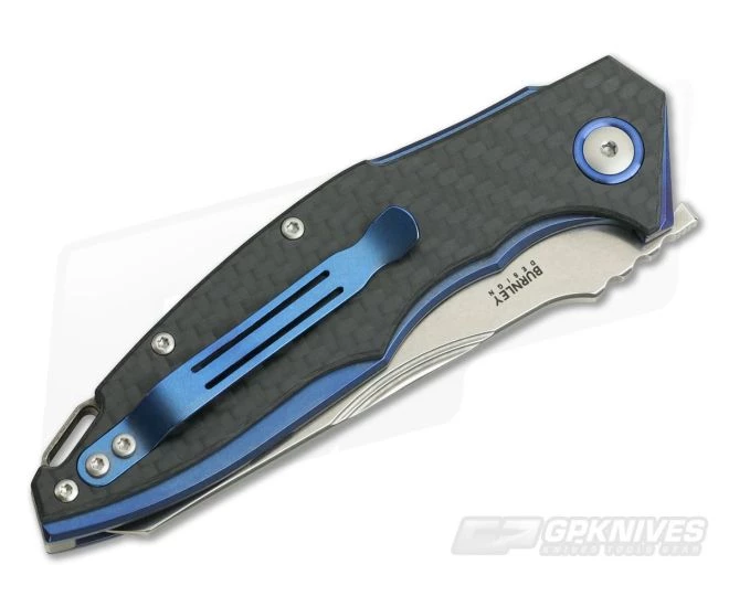 Handle:Â Blue anodized titanium handle slabs are chamfered for comfort and support gorgeous carbon fiber overlays. A full titanium backspacer gives the Raut great balance in the hand and provides a generous oval hole for lanyard attachment. The integral frame lock mechanism provides smooth, reliable operation for safe use. The construction is rounded out with Grey Torx hardware along with a right hand, tip-up, titanium pocket clip and dual pivot collars which are anodized to match the frame.