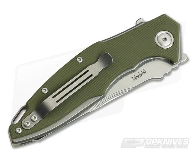 Handle:Â Stonewashed titanium handle slabs are chamfered for comfort and support utilitarian Green G10 overlays. A full titanium backspacer gives the Raut great balance in the hand and provides a generous oval hole for lanyard attachment. The integral frame lock mechanism provides smooth, reliable operation for safe use. The construction is rounded out with Grey Torx hardware along with a right hand, tip-up, titanium pocket clip and dual pivot collars.