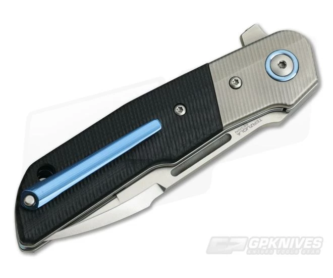 Handle: The handle is also iconic Terzuola with a stepped design that is surprisingly comfortable and secure. This version is classed up with milled titanium bolsters flush fit to rugged black G10 scales with the same milled texture. The handles are contoured for comfort and supported by sturdy, stainless steel liners. One liner forms the lock mechanism which offers smooth, reliable operation. A single barrel spacer, blue anodized pivot collars, backspacer and 3D titanium pocket clip complete this modern classic. A generous hole is provided for lanyard attachment.