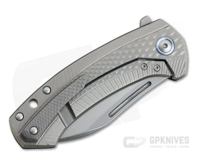 Handle: This version comes with a 3D textured and contoured black G10 front scale and matching titanium integral frame lock construction with hardened steel lock face insert. The dual texture handle milling provides comfort and traction with a semi-open back construction for ease of maintenance. The generous handle design accommodates multiple grip positions and hand sizes. Titanium hardware and blue anodized pivot collar round out the construction with a generous hole provided for lanyard attachment. Includes nylon zip pouch for transport and storage.