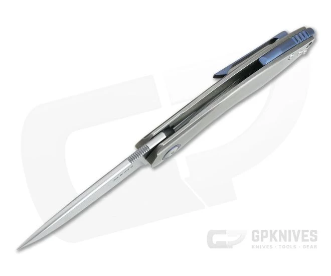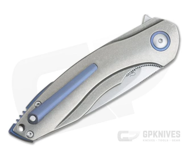 Handle:Â A stainless steel liner is nested within the 3D contoured titanium handle scales that have been finished with a heavy stonewashed finish that is non-reflective and hides wear from use and carry. The handles are nicely contoured for a secure and ergonomic grip. The construction is completed with titanium hardware including a blue anodized pivot collar and back spacer.
