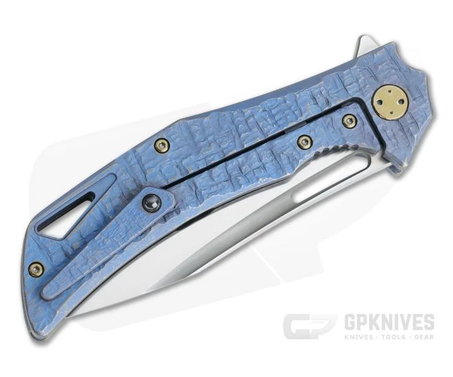 Handle:Â Two solid slabs of titanium form the handle in a highly comfortable and ergonomic design. All the edges are chamfered to reduce hot points with an Experimental hand texture that enhances traction while offering unprecedented style complemented with a blue over bronze anodized finish. Both the 3D machined pocket clip and floating back spacer feature the same finish as the handles. Notches on the frame lock bar makes disengagement easy while a steel insert on the lock face provides smooth operation. Inside the back spacer is marked “SWISH” and “S481” and a generous cutout near the end of the handle allows for easy lanyard attachment.