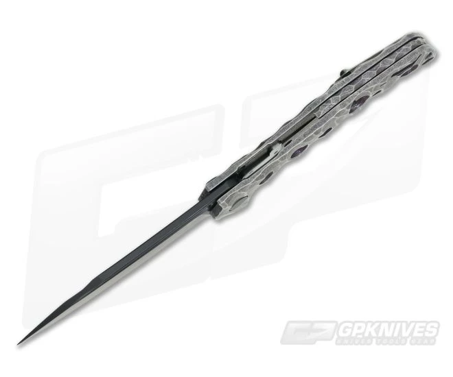 The Handle:Â Two solid slabs of titanium form the handle a highly comfortable and ergonomic design. All the edges are contoured to reduce hot points. All hardware is black PVD coated like the blade. The scales feature Olamic’s ‘Seabed’ finish’, a randomly milled pattern that ends up being matte grey in color with subtle hints of purple in some areas. The Seabed finish is embellished with 7 ‘Funky Holes’ that fit well with the asymmetric milling and add some additional traction. Both the 3D machined pocket clip and floating backspacer feature the same Seabed finish as the handles. The inside of the backspacer is marked “SWISH” and “S305”. Notches on the frame lock bar makes disengagement easy while a steel insert on the lock face provides smooth operation. A generous cutout near the end of the handle allows for easy lanyard attachment.
