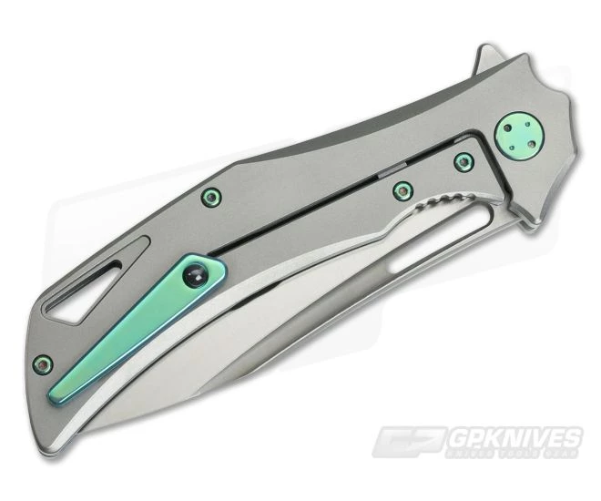 The Handle:Â Two solid slabs of titanium form the handle a highly comfortable and ergonomic design. All the edges are contoured to reduce hot points. The Lightblast finish offers a visual texture for interest with a smooth in-hand feel. The highlights of the handle construction are the Green anodized “5 Hole” pattern milling with matching hardware, pocket clip and “Nugget” textured floating backspacer. The inside of the backspacer is marked “SWISH” and “S343”. Notches on the frame lock bar makes disengagement easy while a steel insert on the lock face provides smooth operation. A generous cutout near the end of the handle allows for easy lanyard attachment.