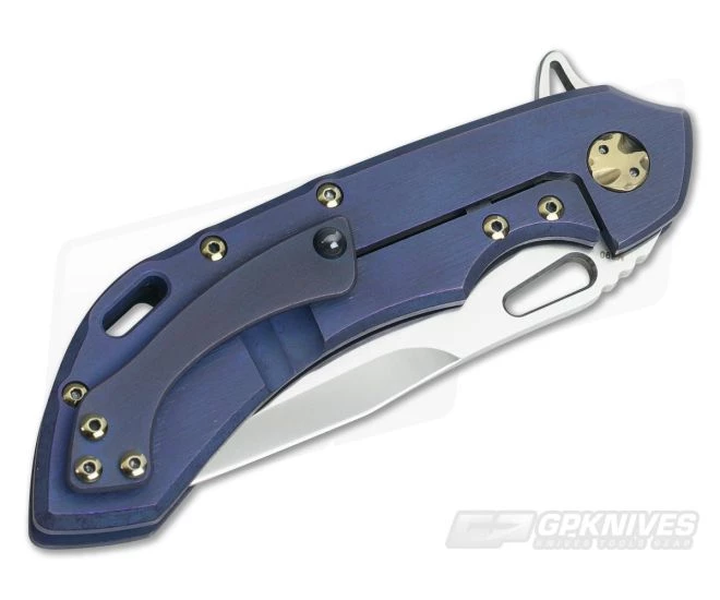 The Handle:Â The ergonomic handle design locks the knife into the hand for secure use and all the edges are contoured to reduce hot spots. The Kinetic Ocean finish has a brushed denim blue look with gold hole cutouts. The titanium frame lock has a steel lock face insert that holds the ceramic detent ball and has a tab that doubles as an over-travel stop. A sculpted, anodized floating titanium backspacer has “WAYFARER 247” and the serial number “T862” on the inside with custom pivot. A nice lanyard hole cutout on the humpback of the handle is included along with all-titanium gold hardware. The backspacer and hardware are anodized to match.