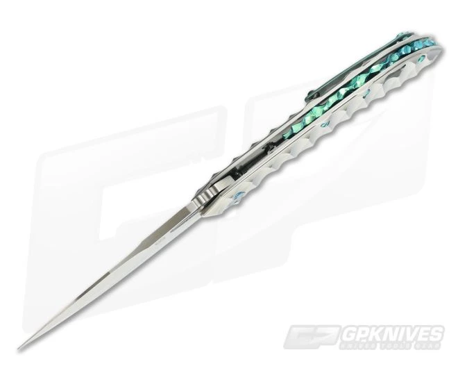 The Handle: The ergonomic handle design locks the knife into the hand for secure use and all the edges are contoured to reduce hot spots. The Scalloped texture on the handle scales is comfortable while adding traction in the hand. The handles have an eye-catching high-polish finish that set off the green anodized titanium hardware, pocket clip and “Nugget” textured floating backspacer. The titanium frame lock has a steel lock face insert that holds the ceramic detent ball and doubles as an over-travel stop. The interior of the backspacer is etched with “WAYFARER 247” and the serial number “T1003”. An oval hole cutout on the back of the handle allows for easy attachment of a lanyard.