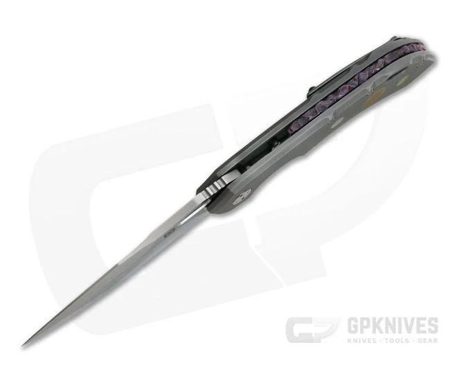 Handle:Â The ergonomic handle design locks the knife into the hand for secure use and all the edges are contoured to reduce hot spots. The titanium is dark blast finished with blue 3 dot inlay and a complementary purple hardware. The titanium frame lock has a steel lock face insert that holds the ceramic detent ball and has a tab that doubles as an over-travel stop. A matte, purple anodized “Nugget” textured floating titanium backspacer has “WAYFARER 247” and the serial number “T1320” on the inside. A nice lanyard hole cutout is included on the back of the handle along with purple anodized titanium hardware which match the backspacer. Includes an Olamic soft sided zipper pouch, Olamic pivot tooland certificate of authenticity.