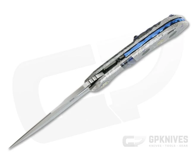 Handle:Â The ergonomic handle design locks the knife into the hand for secure use and all the edges are contoured to reduce hot spots. The titanium is ‘Frosty’ ice finished with zirc/timascus 3 dot inlay pattern and an accenting blue Mammoth tooth stripe inlay with complementary blue hardware. The titanium frame lock has a steel lock face insert that holds the ceramic detent ball and has a tab that doubles as an over-travel stop. A polished, blue anodized sculpted textured floating titanium backspacer has “WAYFARER 247” and the serial number “T1321” on the inside. A nice lanyard hole cutout is included on the back of the handle along with blue anodized titanium hardware which match the backspacer. Includes an Olamic soft sided zipper pouch, Olamic pivot tool and certificate of authenticity.