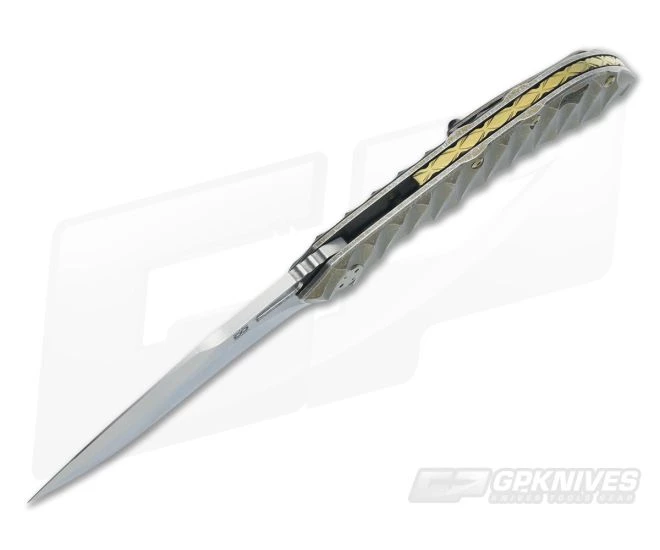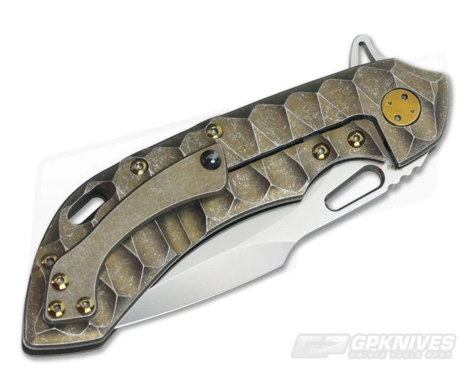 The Handle: The ergonomic handle design locks the knife into the hand for secure use while all the edges are contoured to reduce hot spots. The Scalloped texture on the handles provides an increase in traction while reducing weight. The handles are finished in a stonewashed bronze anodization that has a classy yet subdued look. The titanium frame lock has a steel lock face insert that holds the ceramic detent ball and has a tab that doubles as an over-travel stop. A sculpted, anodized floating titanium backspacer has “WAYFARER 247H” and the serial number “T064H” on the inside. A nice lanyard hole cutout on the humpback of the handle is included along with all-titanium hardware. The backspacer and hardware are anodized a matching polished bronze.
